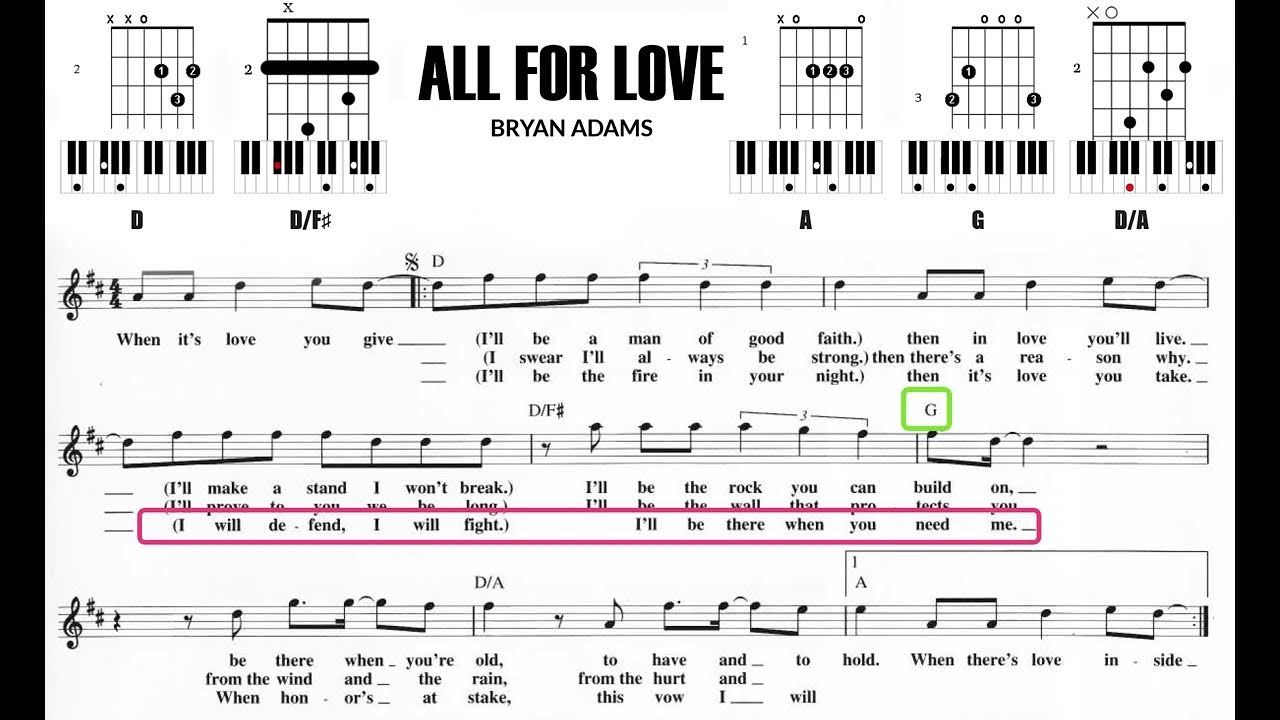 Difficulty: Novice All for love Bryan Adams, Rod Stewart and Sting D Major D When it's love you give (I'll be a man of good faith.) D Major D Then in love you live. (I'll make a stand. I won't break.) D/F#. Let's make it all for one and all G for love. Em7 Let the one you hold. And make it G all D/F# for Em7 one and A all for D love. When it's love you D make (I'll be the fire in your night.) Then it's love you D take (I will defend, I will fight.) D/F# I'll be there when you ne G ed me.