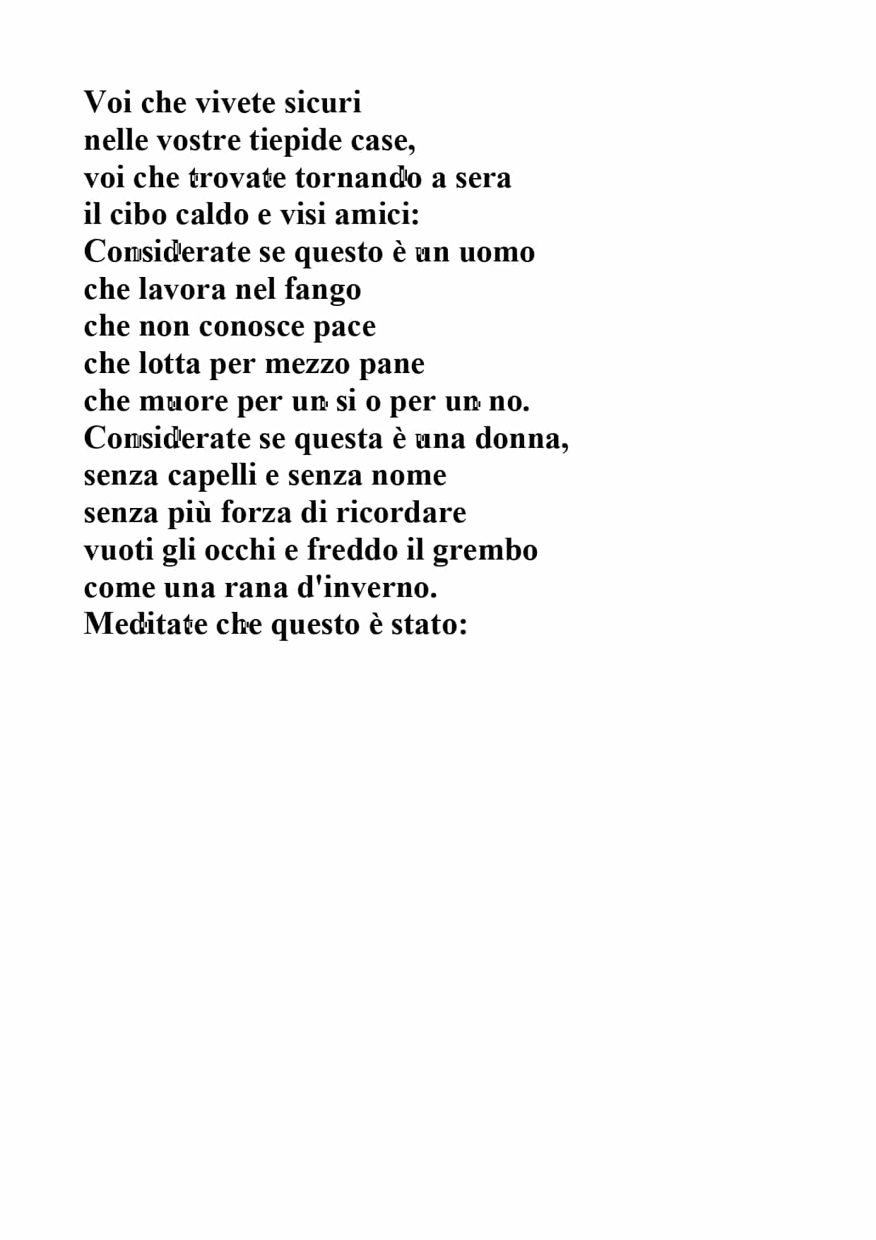 Se questo è un uomo - trama e analisi dell'intero romanzo. SHEMÀ - Parafrasi, riassunto e analisi. Una buona giornata - 7 cap "Se questo è un uomo": Levi descrive come lo spuntare di un sole tiepido ed avere una razione in più di zuppa riescano a rendere le condizioni di vita del Lager più sopportabili.. riassunto e analisi della tragedia pastorale in versi che racconta la storia di Mila di Codro, figlia del mago Iorio, e il suo amore impossibile per il pastore Aligi, già destinato al matrimonio con Vienda di Giave.. L'ultimo - 16 cap "Se questo è un uomo": la dignità e il coraggio di un detenuto condannaro all'impiccagione per atti di.